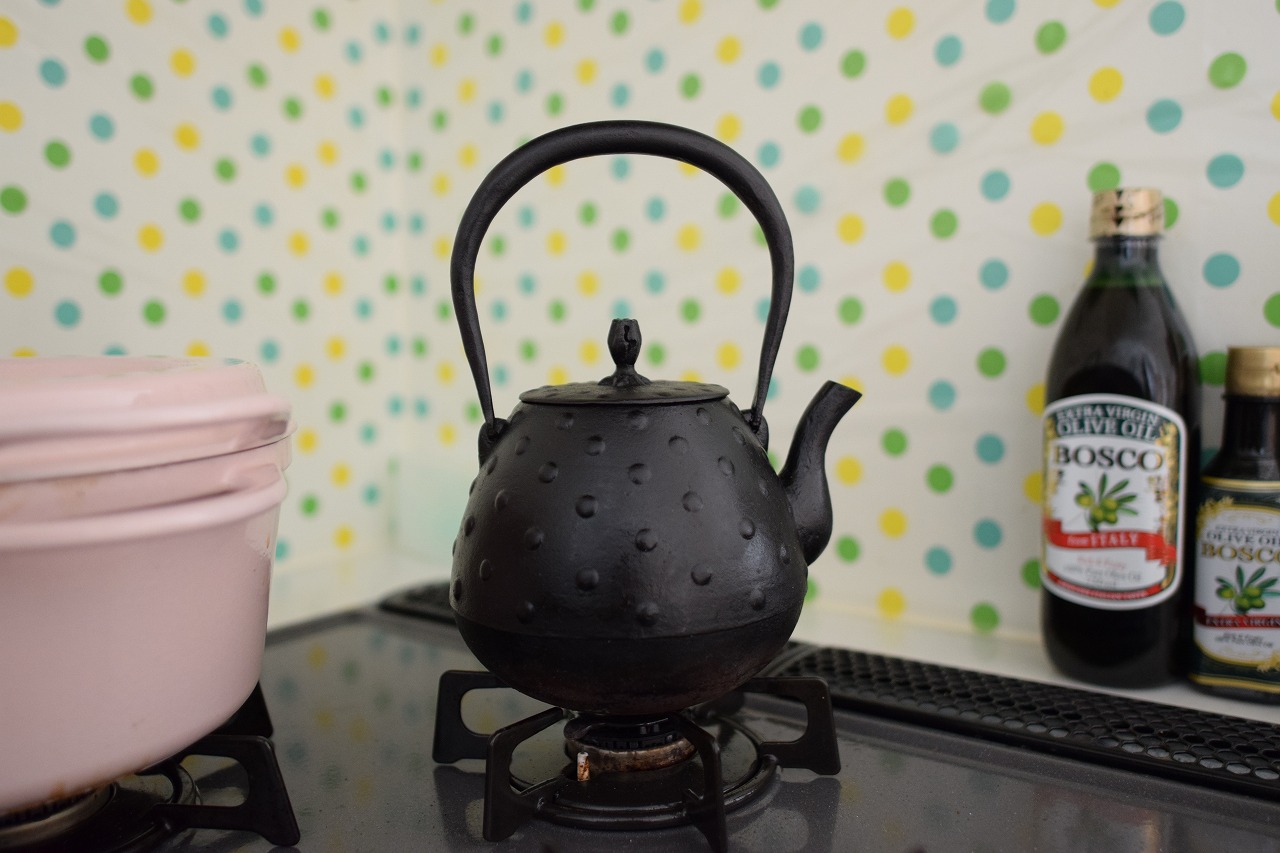 あと、わが家の鉄瓶は若干小ぶりのサイズ。なのでコンロの五徳が大きいと上手に乗らないおそれがあります。