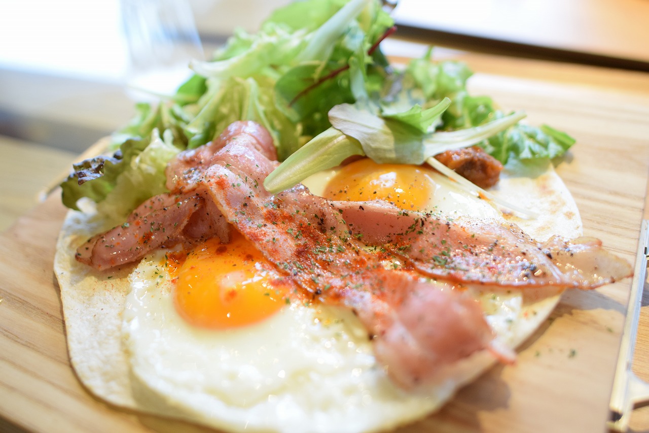 平たく言うと、目玉焼き・サラダ・ベーコンon トルティーヤ。
