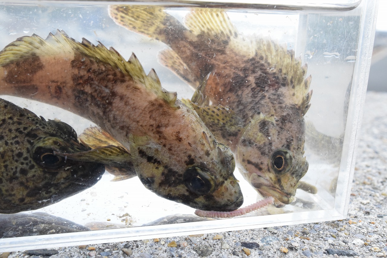 ですがカサゴやアイナメなどの根魚と呼ばれるサカナたちは冬でも元気なので、テトラポッドの間にエサを落とすと勢いよく食いついてきます!