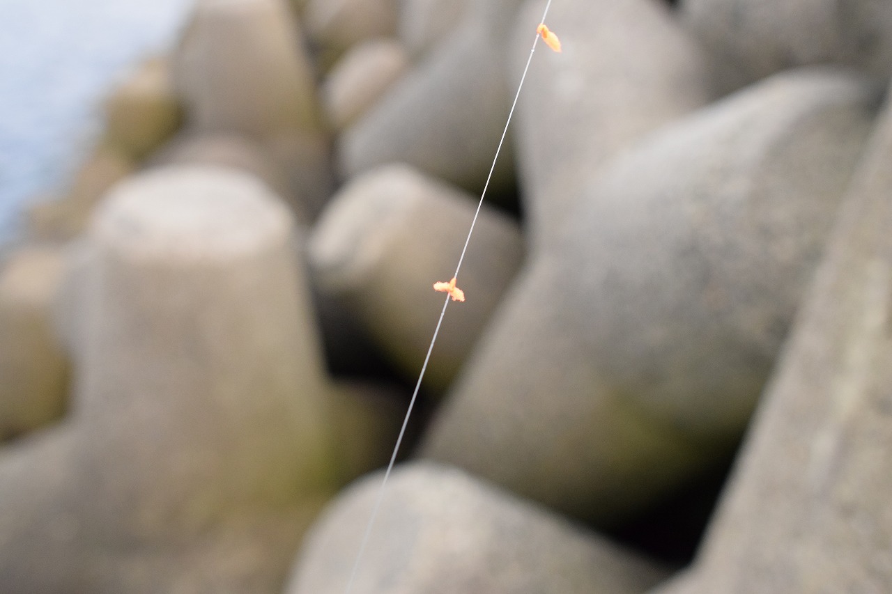 仕掛けが底についたり、テトラのどこかで止まったら竿を小さく上下させます。