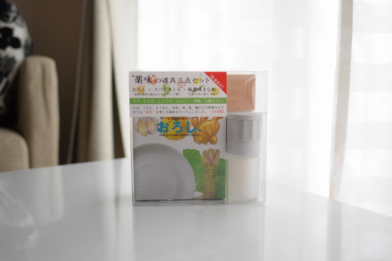 「おろし(ポーレックス製!)、スパイスミル、桧薬味まな板」となってます。