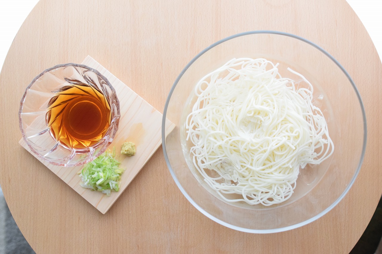 素麺とも冷や麦とも違う、もうこれを食べたら他は無理!ってなるくらい病み付きになるのがオカベの麺。