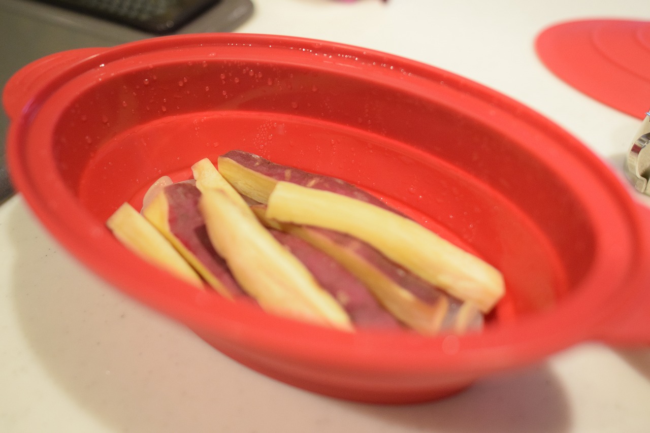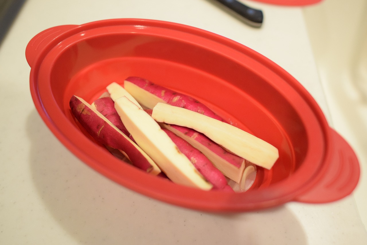 2:シリコンスチーマーに切ったサツマイモを入れ、電子レンジで600W4分加熱する