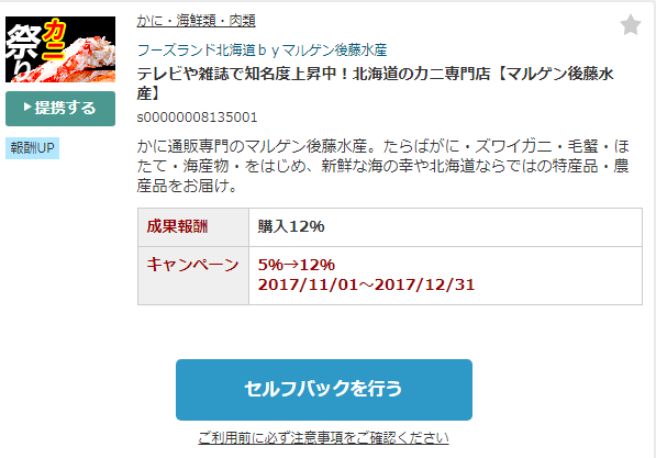 ちなみにセルフバックはカードを作るだけではありません。上のカニのように、購入した代金の数%が成果報酬として戻ってくる、みたいなのも多いですよ!