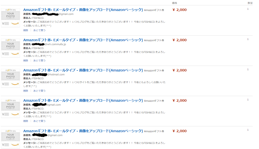 当選された方5名様には先ほどEメールでギフト券を送信いたしましたので、ご確認をお願いいたします。