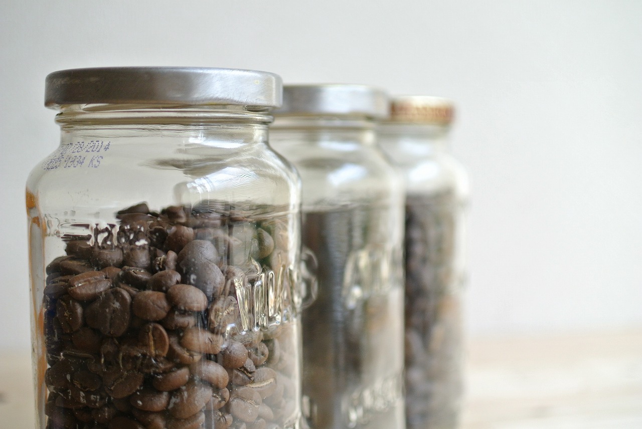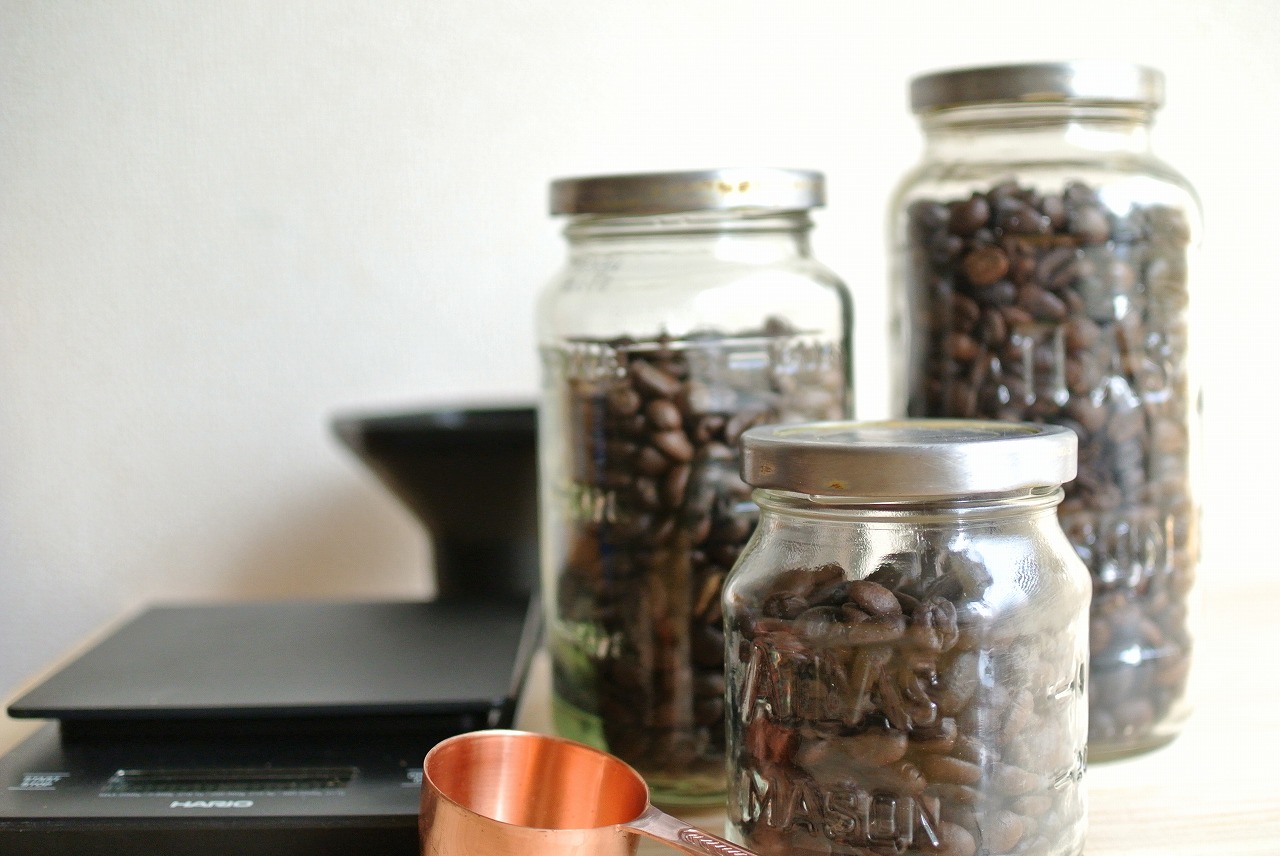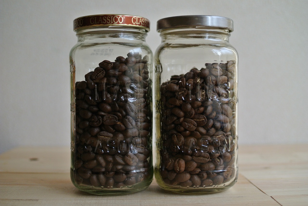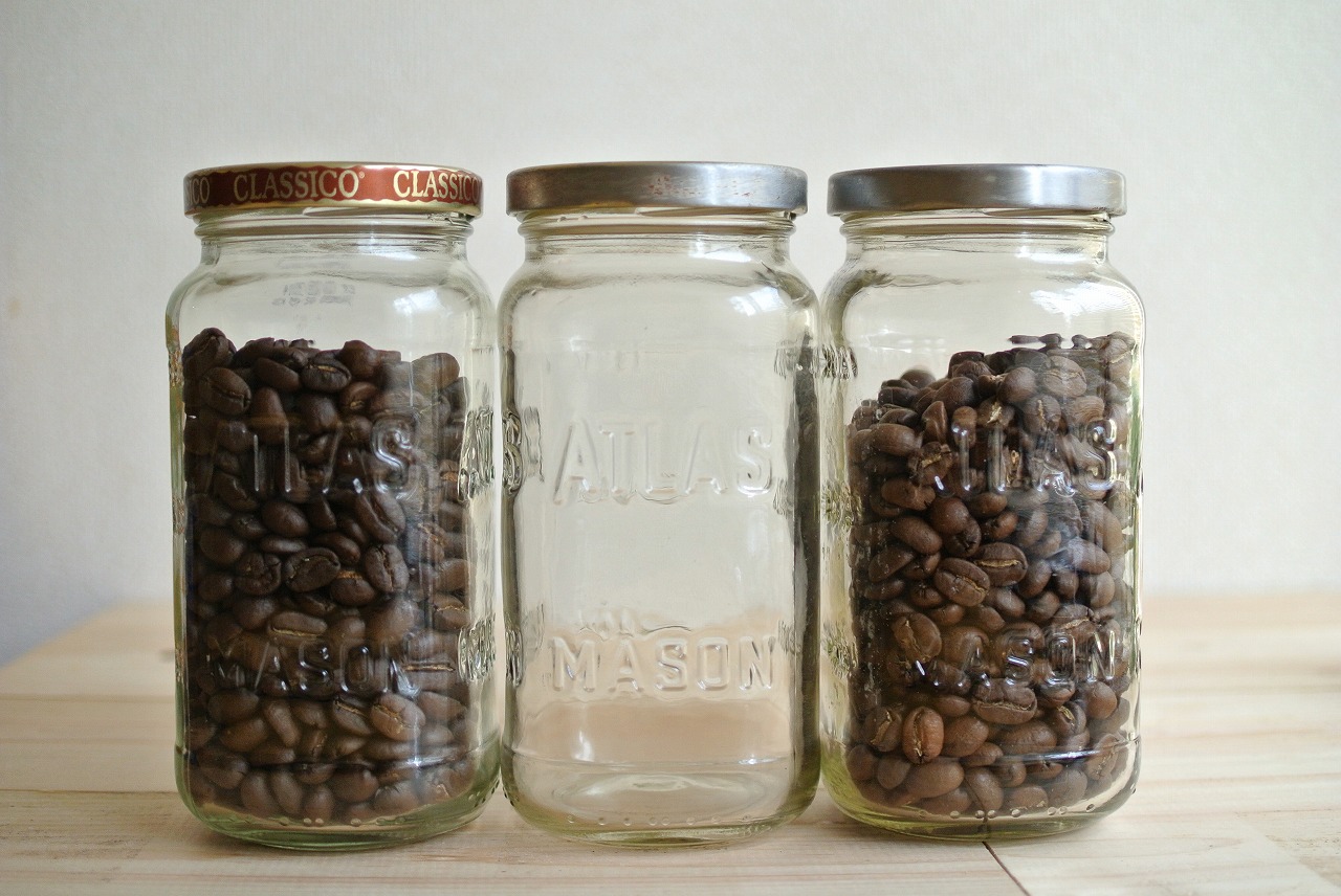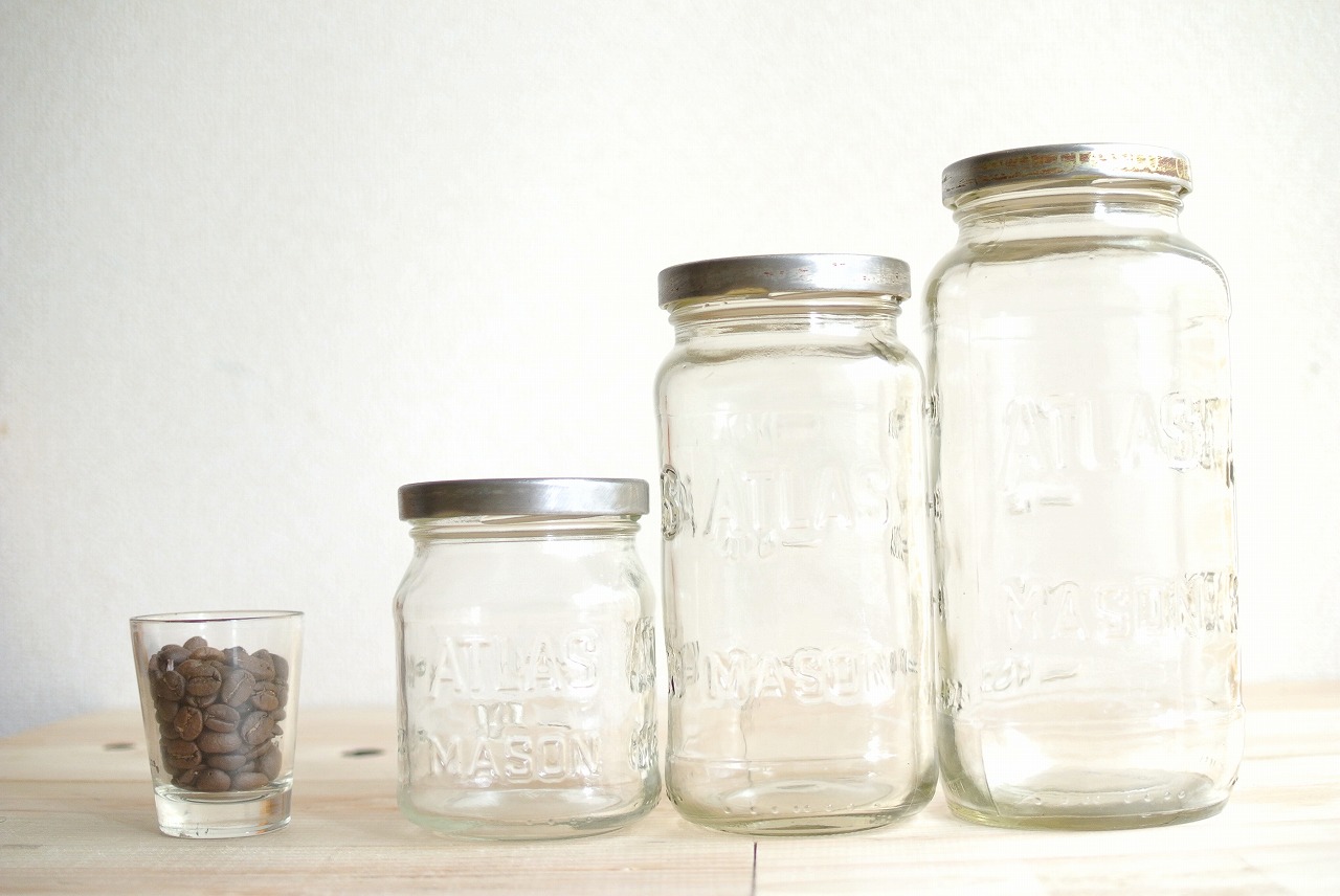小さい瓶には約70g、中くらいの瓶には約140g、大きい瓶には200gのコーヒー豆(焙煎されてる状態)が入りますので、少量ずつ豆を購入されたり焙煎する方にはちょうどいいと思います。