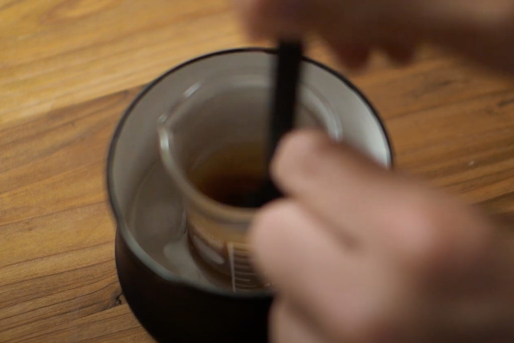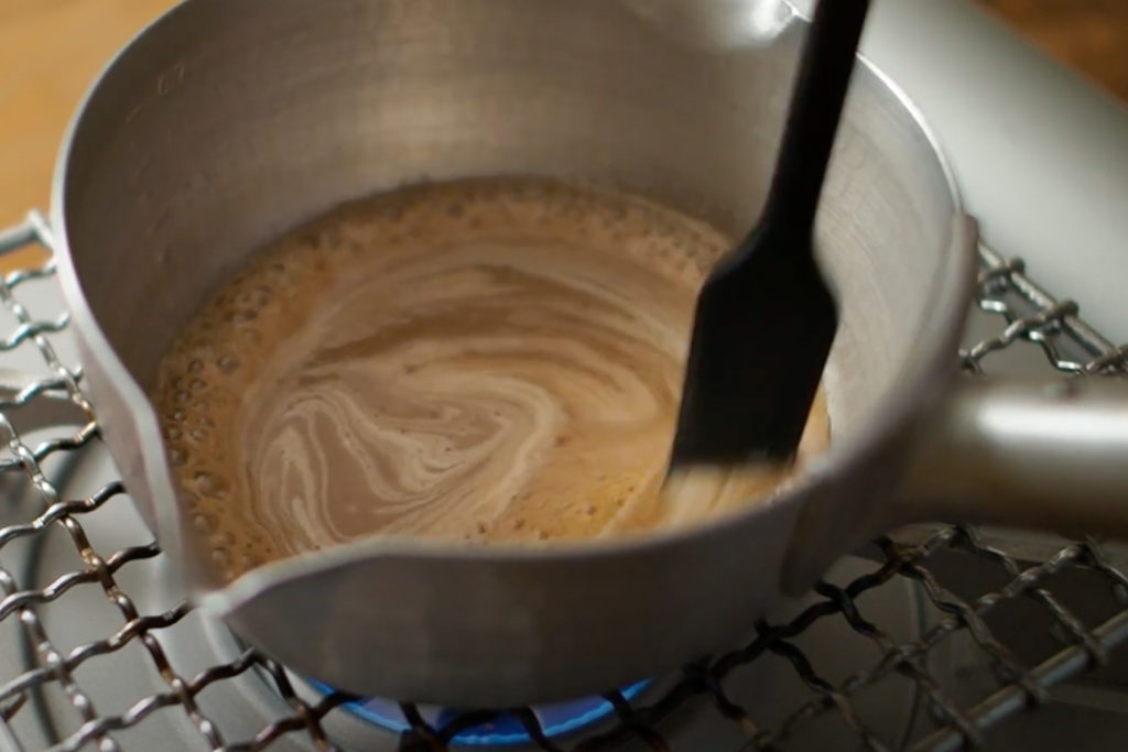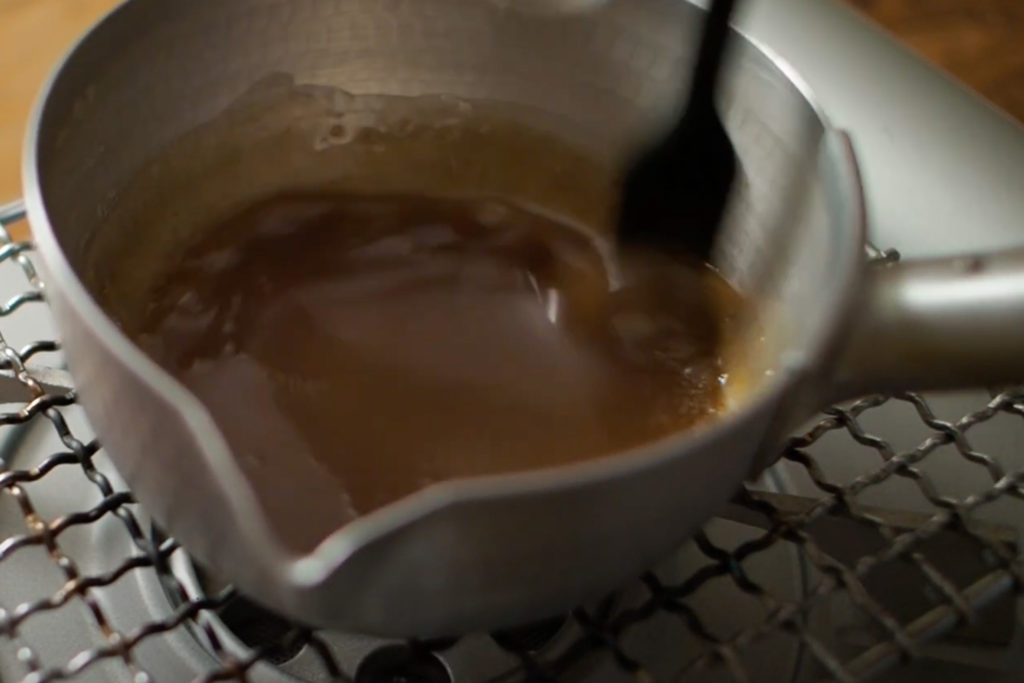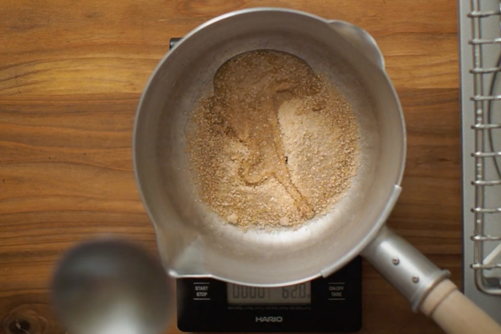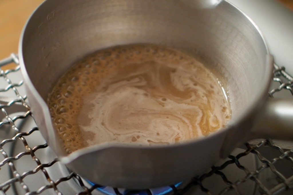 1:てんさい糖と水を手鍋に入れて中火にかける