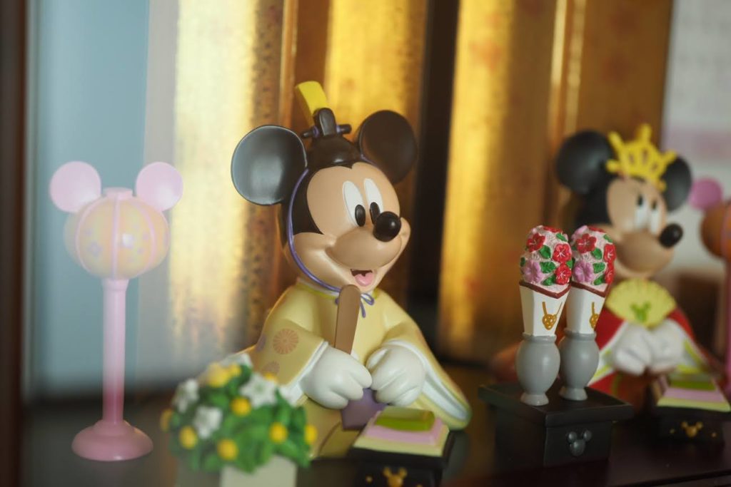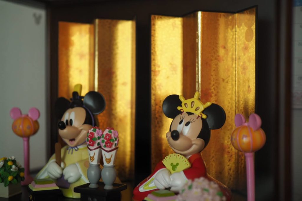普段は奥様の実家に飾っているひな人形。今年は帰省できなかったのでわが家に送ってもらい飾っています。幅が40㎝くらいしかないので現代の住宅事情にはピッタリサイズで何かと都合が良いです。田舎には奥様のおひな様セット(6段くらいあるやつ)あって、それも毎年飾ってますが、娘的にはリアルな顔が怖いらしく、ミッキーの方が好みだそう。