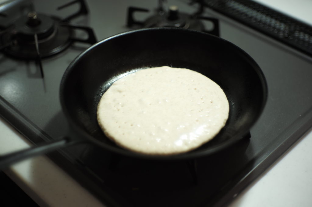 ワタシはめんどくさがり屋なので1袋分すべてを使いましたが、直径26cmのフライパンで3回焼いてちょうど3枚完成。もちろん1枚あたりの仕上がり量はご覧の通りなんですけど、案外火の通りが早くて中心部が生焼けにならずいい感じ。