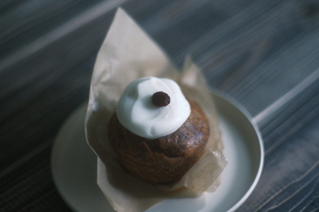 真上から見てもおいしそう。キャロットケーキってお店によって形が違っていて、それも楽しめますよね。何といっても生地とクリームのコントラストが良い。