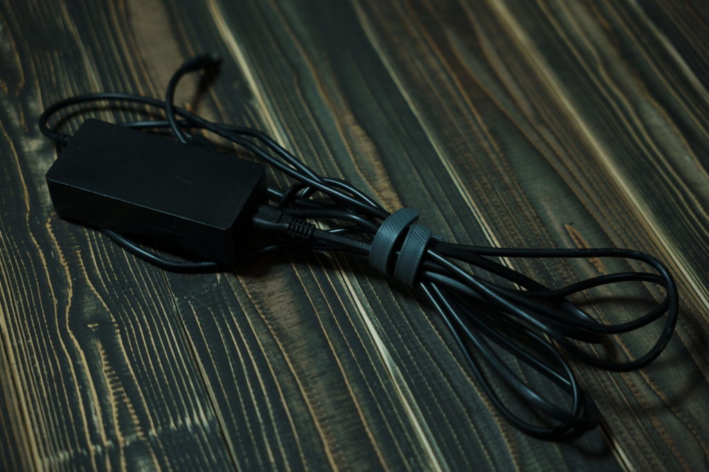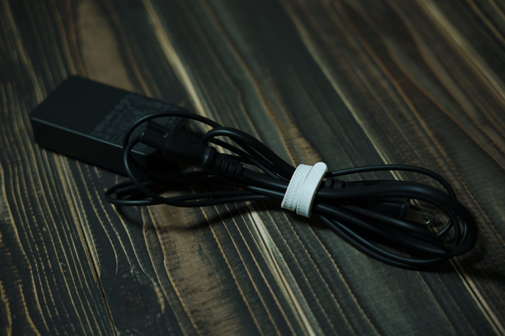 こちらはパソコンのケーブルを束ねてくれています。スマホケーブルより一般的にパソコンのケーブルは長くて太いので、このサイズは重宝しますね。バンド自体の強度もあり簡単には広がらないので、ある程度の太さがあるケーブルでも安心して束ねておくことができます。