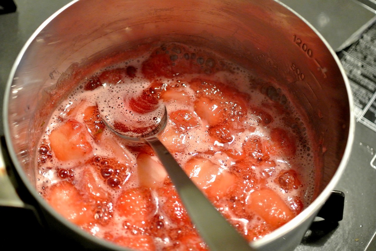 ⑤15分くらい経つと、いちごの水分が外に出てきて砂糖と絡んでいい感じのトロトロ具合になってるので、