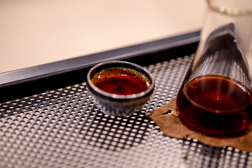 コーヒーはおしゃれなガラスに入っていて、それをおちょこ的な器で飲むスタイル。少しずつ飲むことでコーヒーがだんだん冷めていく中での味の変化を楽しんでほしい、という意図もあるみたいです。