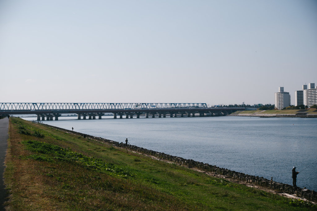 徒歩10分ほどで河川敷に到着。釣り人が規則正しく並んで黙々とキャスティングしている様子を見ながら草の上に腰掛けます。