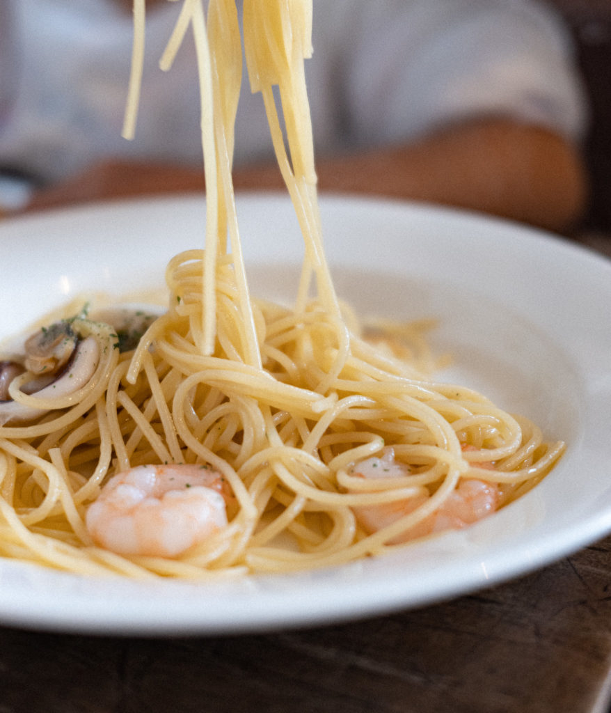 そんなこんなで意外と早くパスタ登場。まずは奥様の。たぶんペスカトーレ的なやつ。
