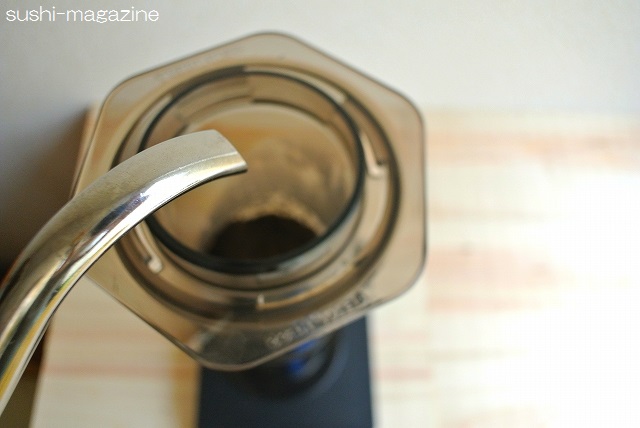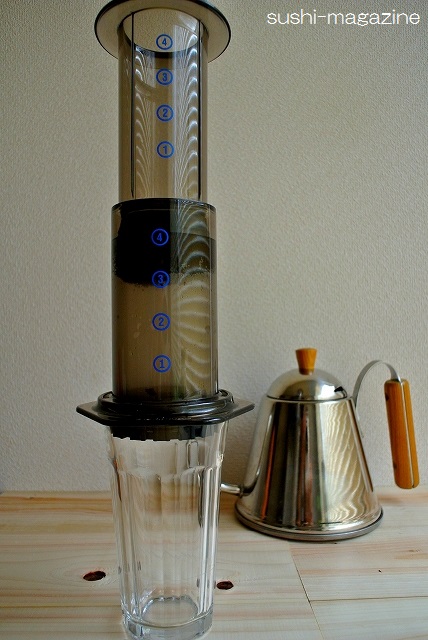 エアロプレスというのは、北欧で火が付いたと言われている抽出器具で、大きい注射器みたいなもので一気に圧力をかけてコーヒーを抽出する、そんな器具。良くも悪くもコーヒーそのものの味や香りをそのまま引き出してくれるので、できるだけ良い状態のコーヒー豆を使うのがオススメです!