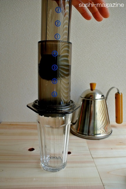 6:1分蒸らしたら、逆さまにしてコップにセット、一気にギューーっとプレス