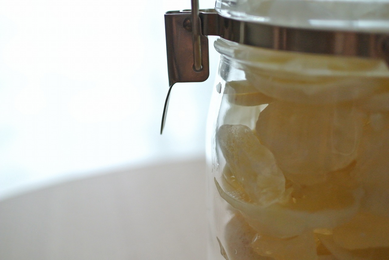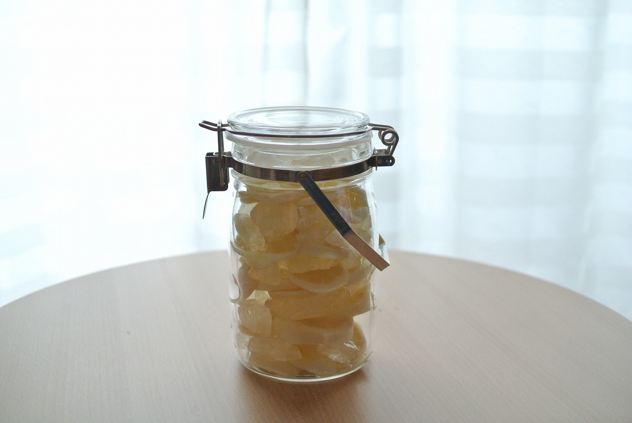 その後ふたたび、レモン、氷砂糖の順で蓋が締まる程度まで積み重ねていきますよ。