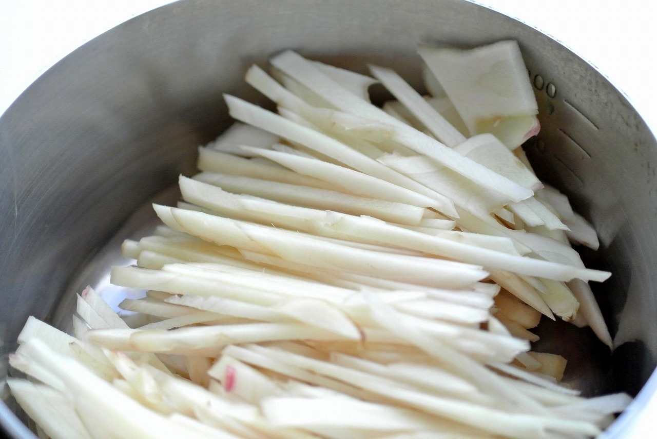 ①しょうがは水で綺麗に汚れを落として皮ごと千切りにする(これがけっこう大変、指を切らないように気をつけてください!)